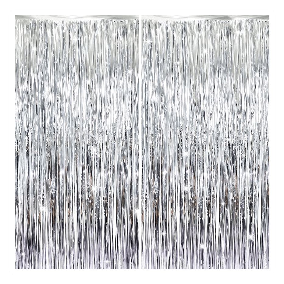 Package Includes:2 pack silver foil fringe curtains,3.2 ft x9.8 ft each,suitable for hanging on a door or coverage a wall fully